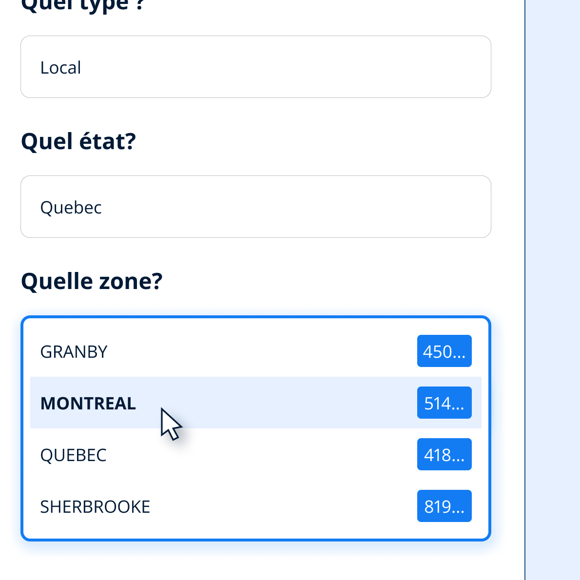 Quicktalk possède des numéros de téléphone dans les principales villes de Canada. Choisissez simplement la ville (ou la ville la plus proche) dans laquelle se trouve votre entreprise.